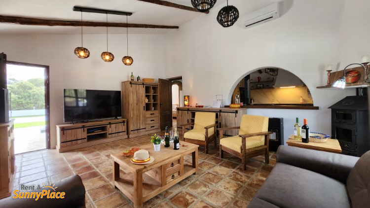 - Woonkamer met Moderne Voorzieningen: Voorzien van een hoekbank voor vier personen, grote smart TV, wijnkoeler, palletkachel en airconditioning. Er is directe toegang tot de veranda en het terras bij het zwembad.