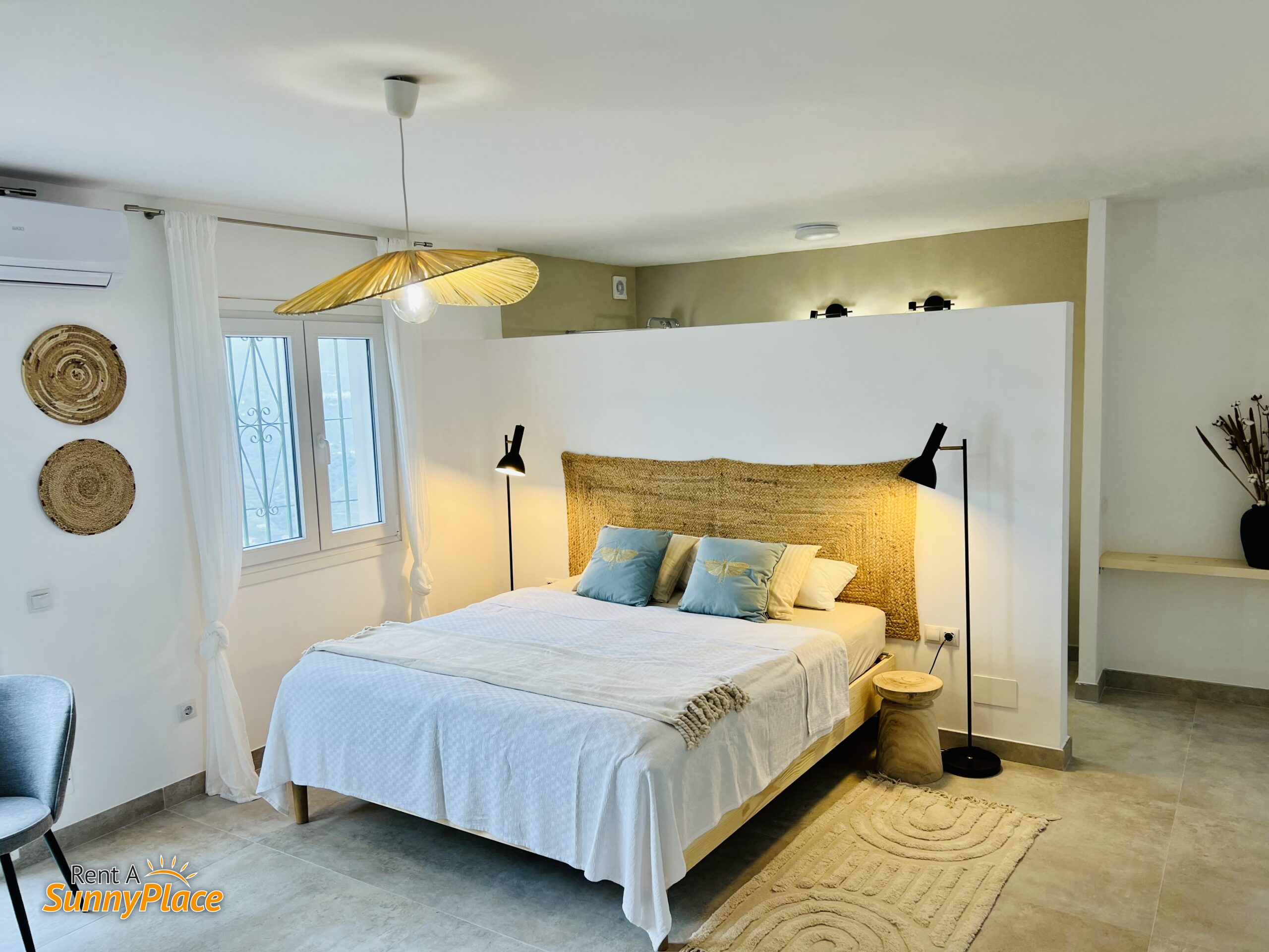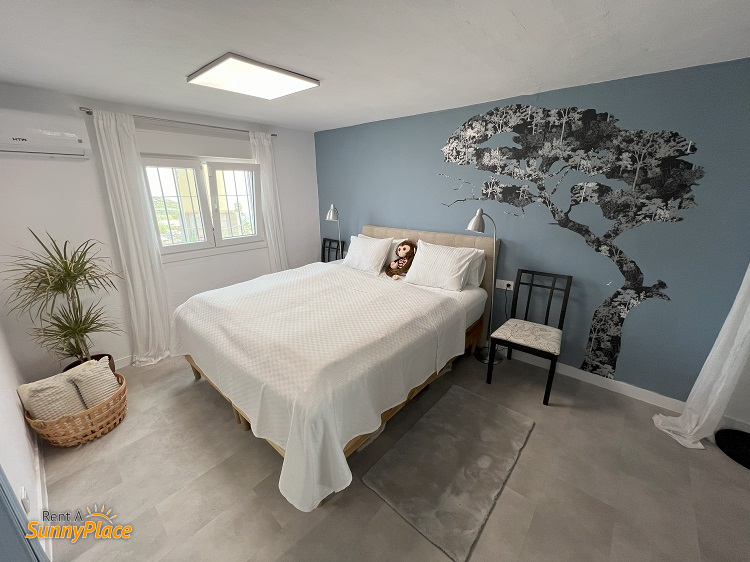 - Open woon-/slaapkamer 3 met tweepersoonsbed, open haard (momenteel buiten gebruik), Smart TV, airco en twee gezellige zithoekjes met uitzicht op zee en bergen. Inclusief koffiesetje, kleine koelkast en magnetron.