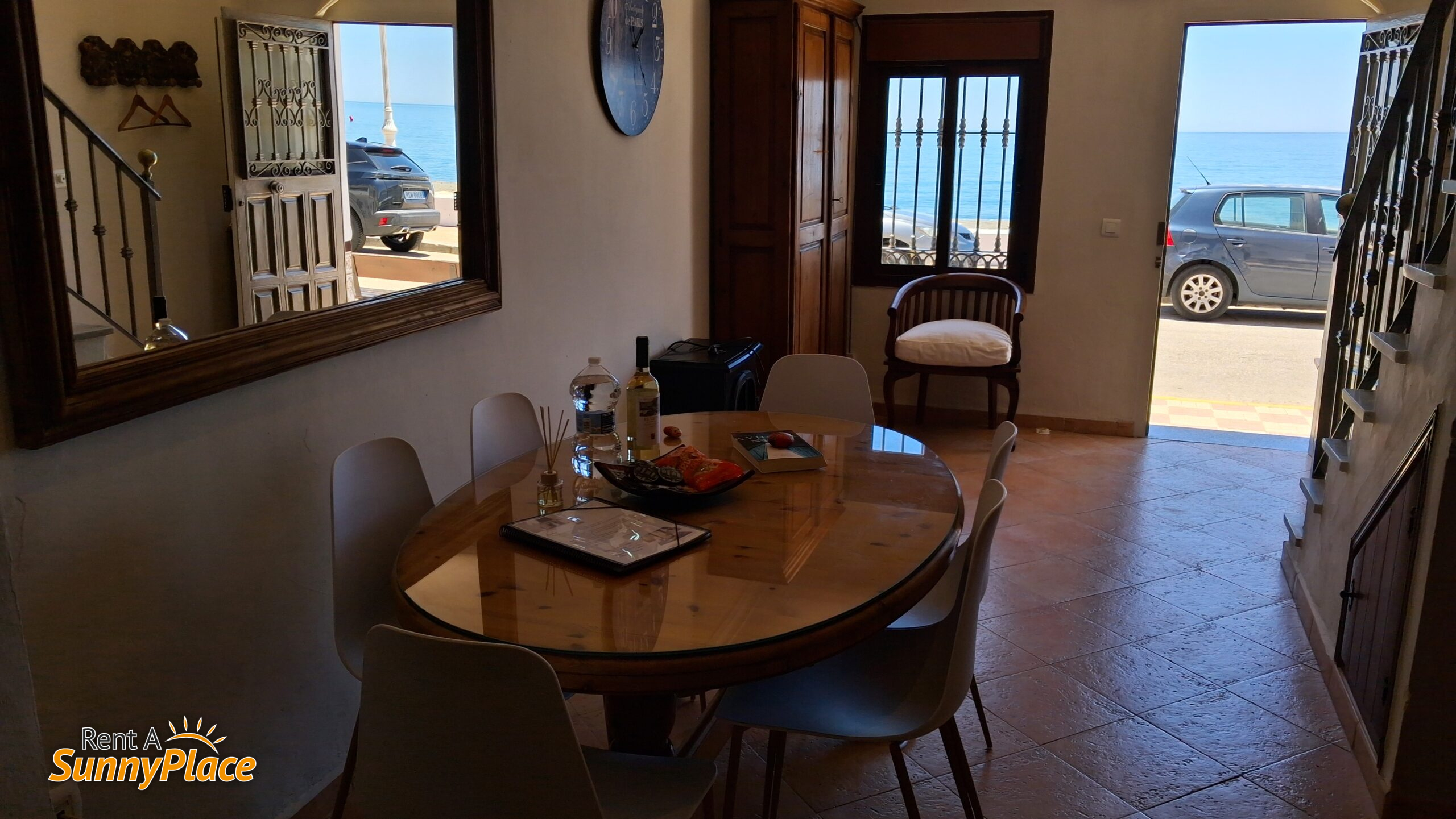Enter through the main door into the welcoming dining room with air conditioning and a table for six. Enjoy sea views through the window and the half-opening front door.