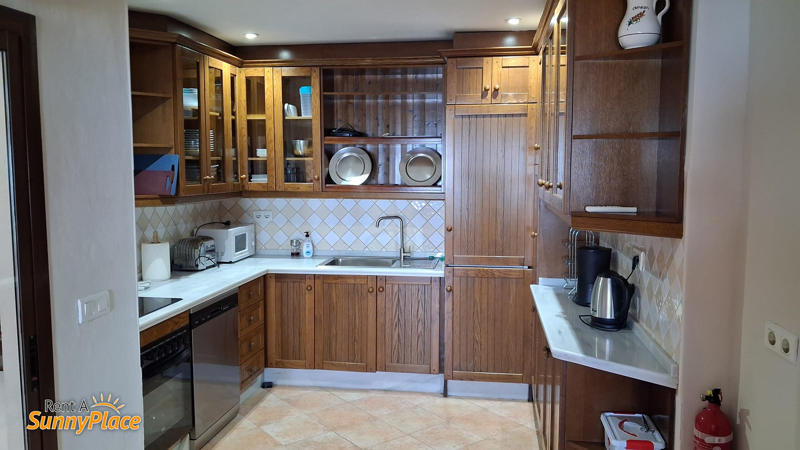 The open-plan kitchen is fully equipped with a fridge/freezer, filter coffee maker, kettle, ceramic hob, and all cooking essentials.