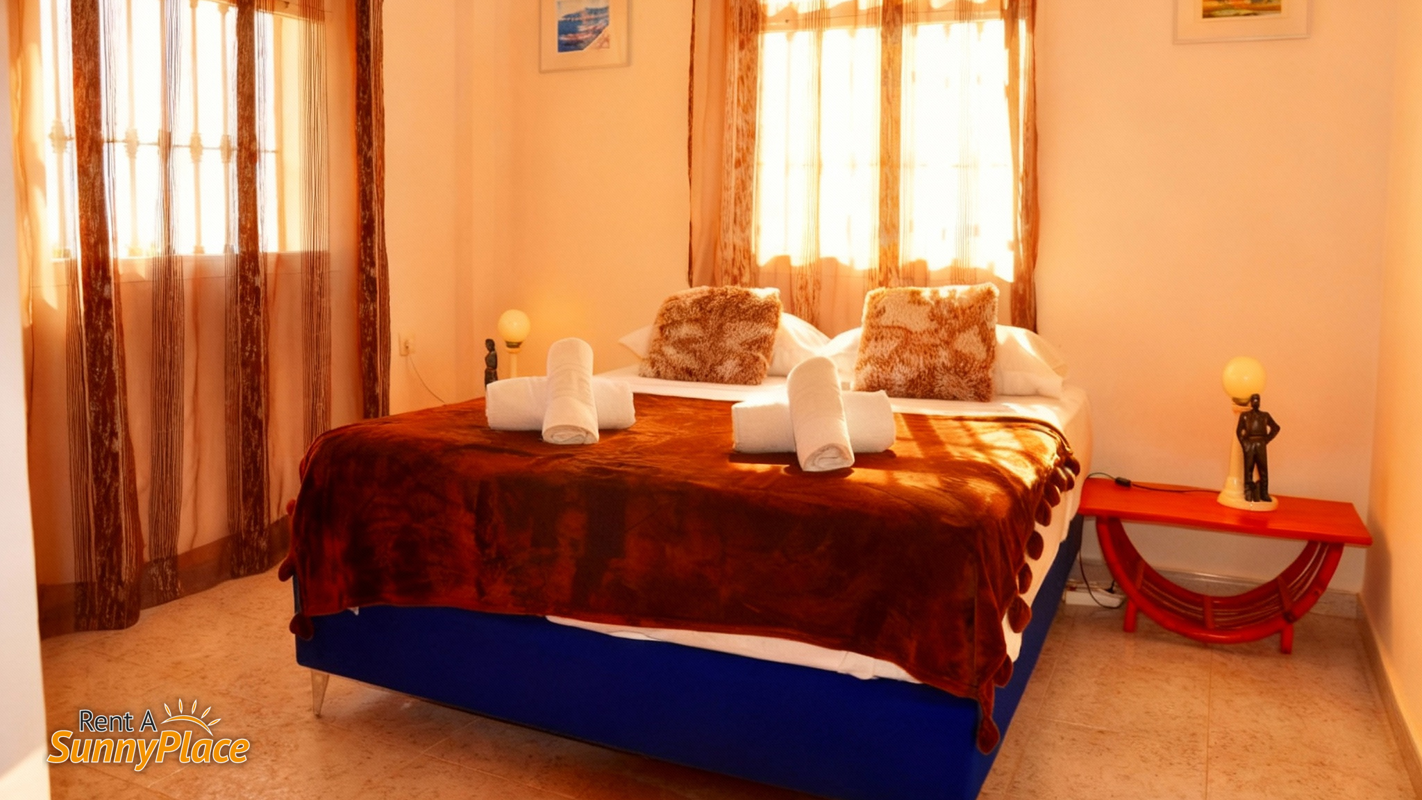- Bedroom 2 (Lower Floor): Double bed with views of the pool, mountains, and sea.
