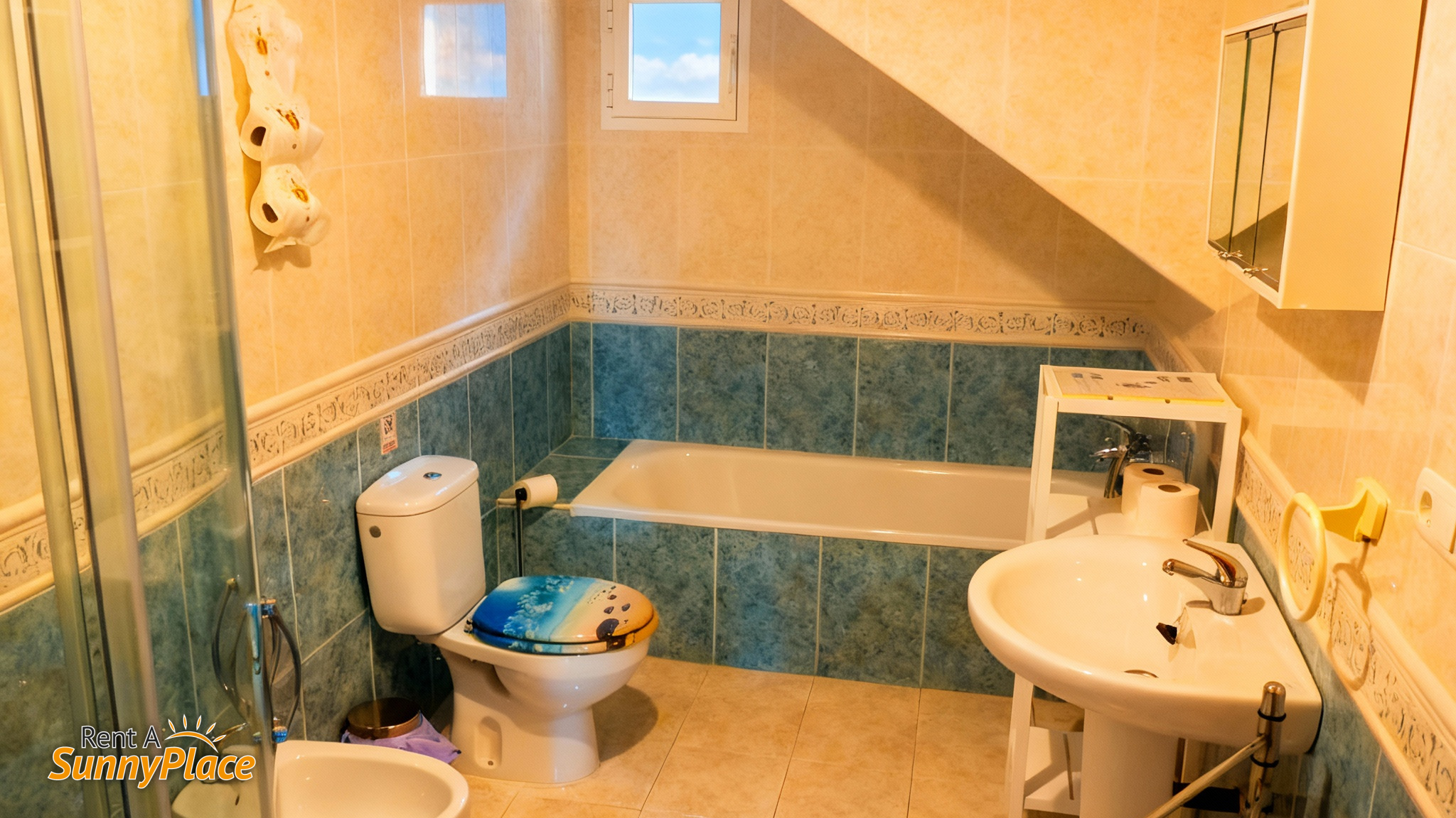 - Bathrooms: Two bathrooms, including an ensuite with the master bedroom. The second bathroom on the lower floor features a bathtub, shower cabin, and bidet.