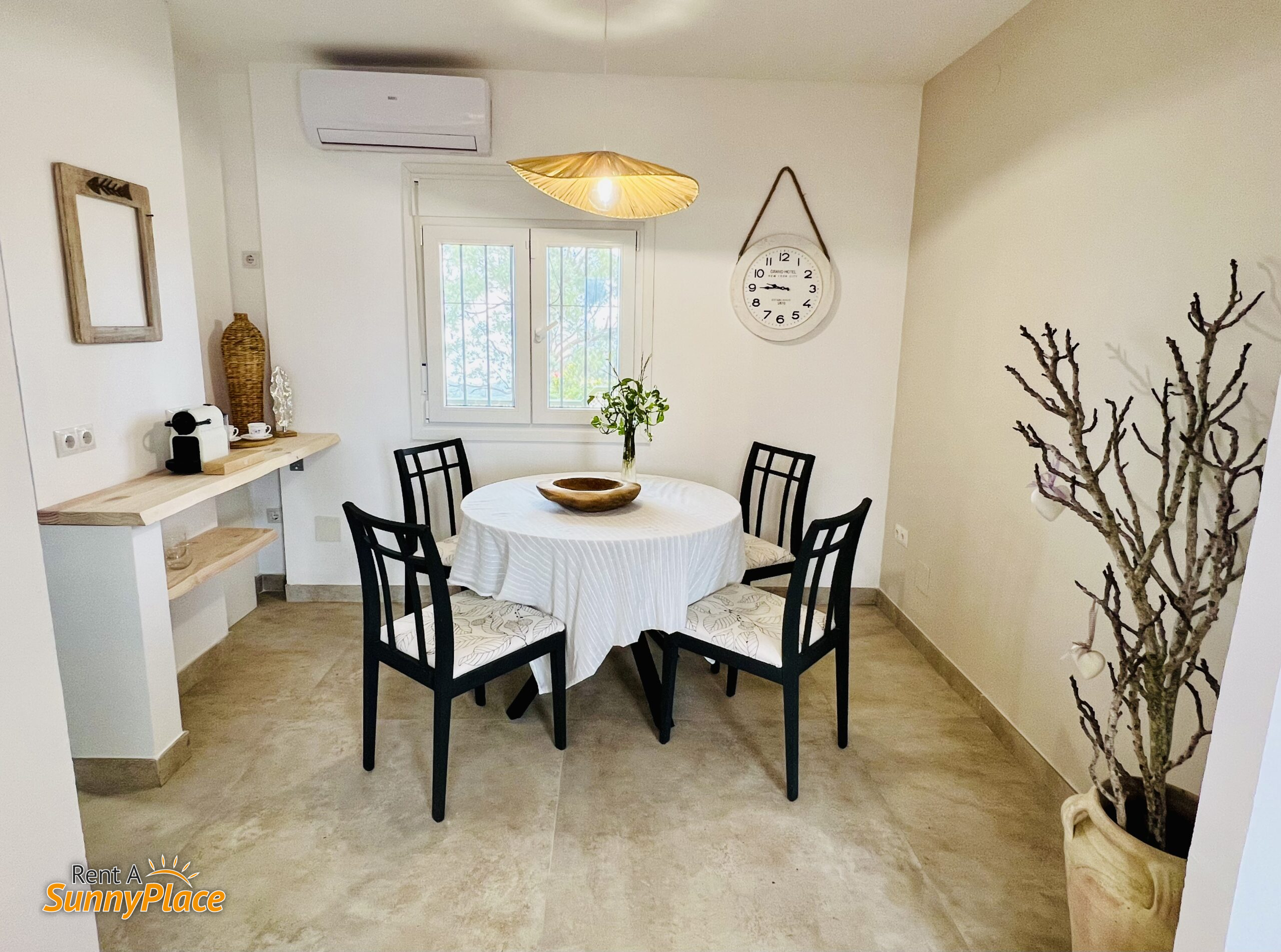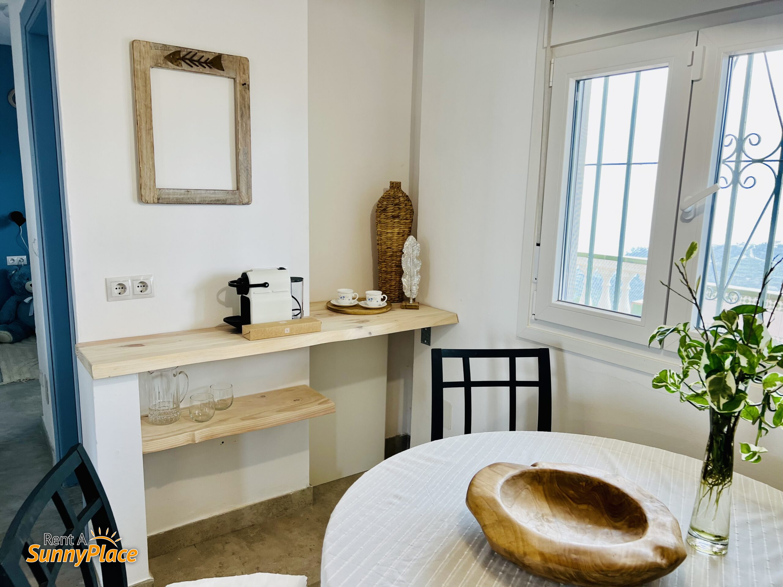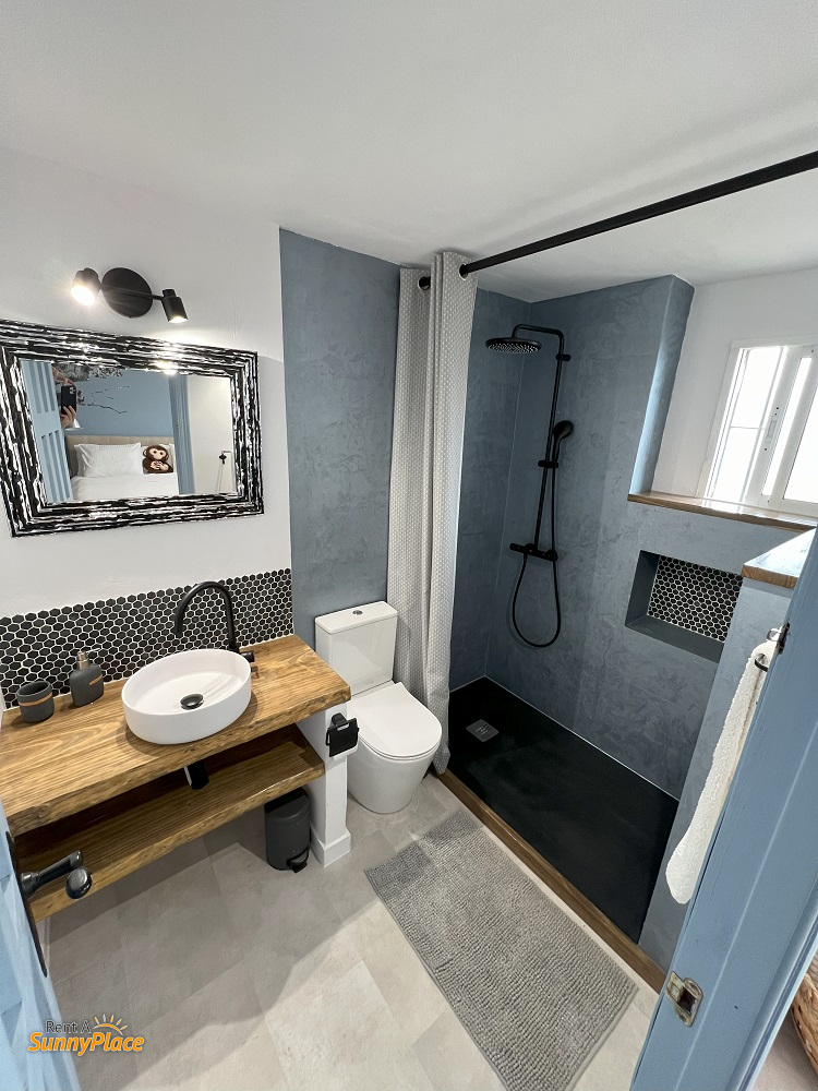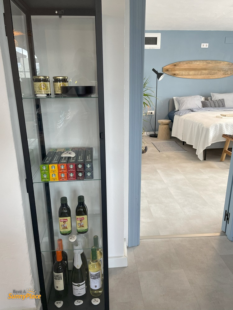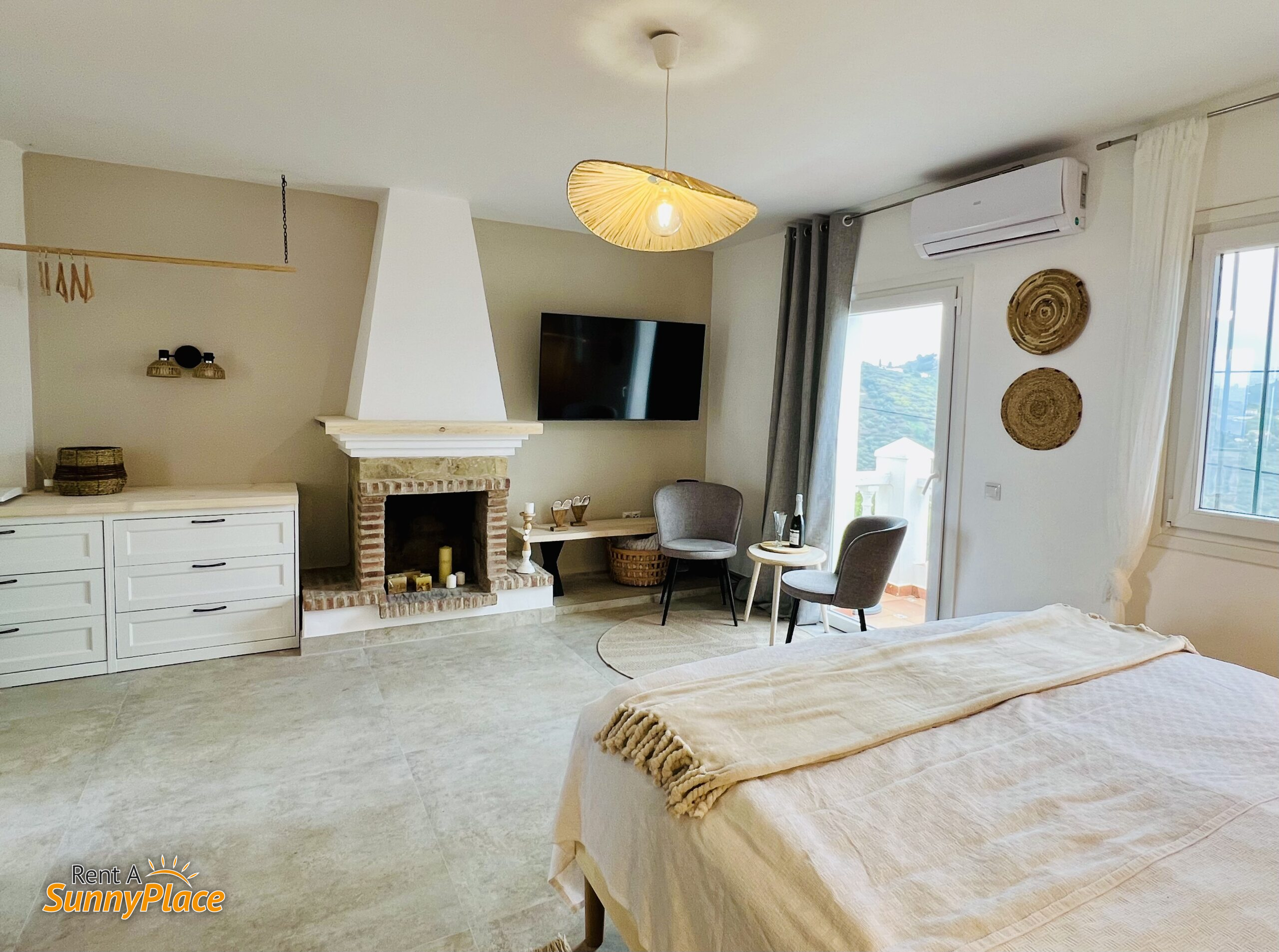 • Open-plan living/bedroom 3: Double bed, fireplace (currently out of service), Smart TV, air conditioning, and two cosy seating areas — one with mountain views, the other with sea views — plus a coffee corner, small fridge and microwave