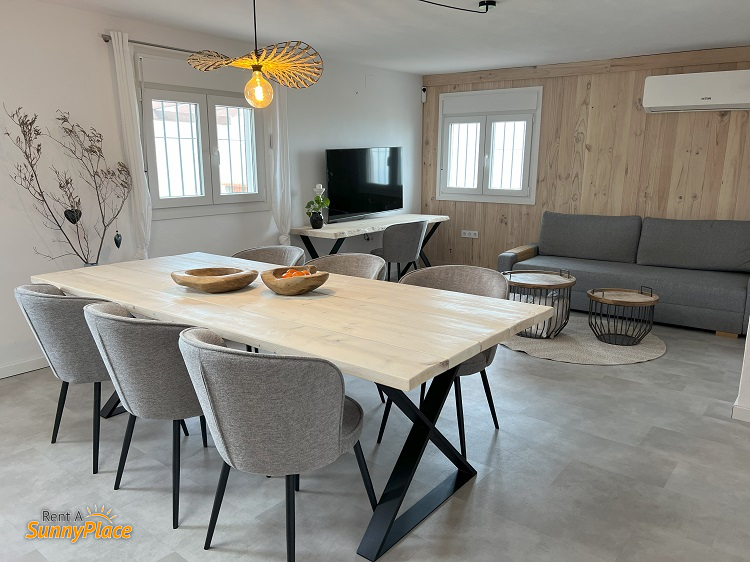 • Living room with a large three-seater sofa bed (190 x 140 cm), SMART TV with international channels (IPTV), air conditioning, and a dining table for 7