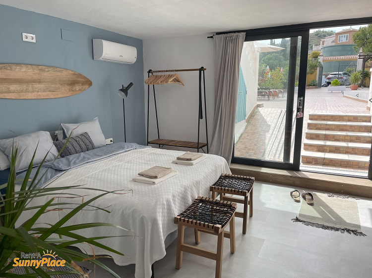 • Bedroom 1: Double bed, sliding doors to the pool, wardrobe, air conditioning, and ensuite bathroom with shower and sink