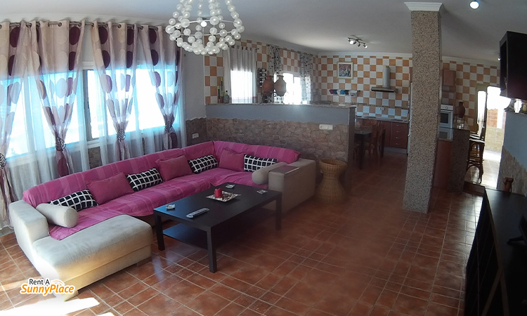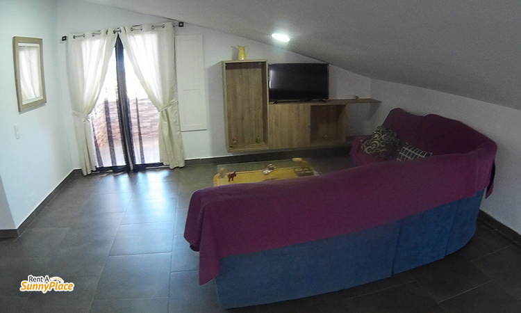 En la planta baja hay una amplia sala de estar (con aire acondicionado) con un largo sofá en forma de U desde donde se puede ver la televisión.