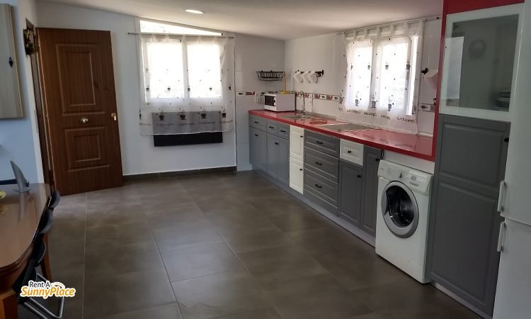 La cocina abierta también tiene una placa de cerámica de 4 fuegos, nevera / congelador, todos los utensilios de cocina, una lavadora y mucho espacio en el armario.