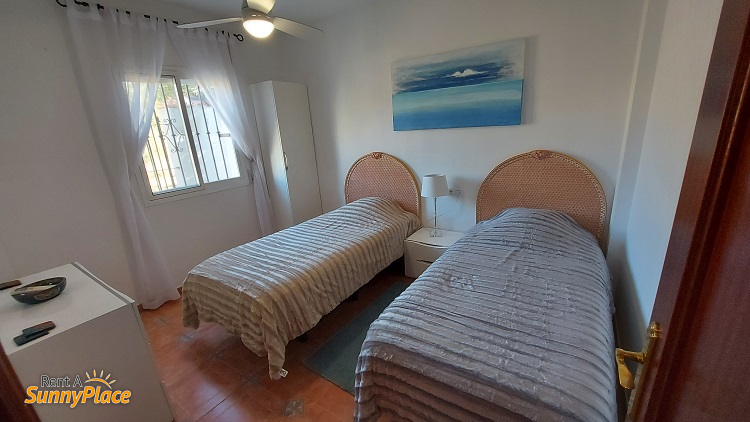 El dormitorio 2 tiene dos camas individuales que se pueden juntar y armarios. Desde aquí también, una hermosa vista de las montañas alrededor de Viñuela. Y tiene aire acondicionado.