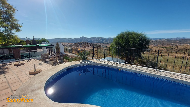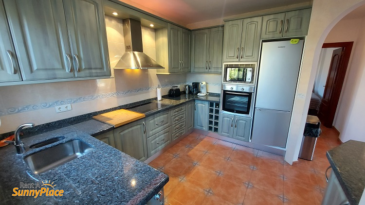 Cocina semiabierta con todas las comodidades. IPTV con canales internacionales en el salón, con chimenea y aire acondicionado. Wifi.El salón dispone de dos sofás de 2 plazas, IPTV y chimenea. La cocina, semiabierta, que está totalmente equipada: vitrocerámica de 4 zonas, lavavajillas, frigorífico/congelador, microondas, horno, todo el menaje de cocina y suficiente espacio de alacena. La mesa del comedor está en el salón con una vista fantástica a la piscina, las montañas y el lago Viñuela gracias a los grandes ventanales.El dormitorio 1 tiene una cama doble y amplios armarios empotrados. Desde la cama una hermosa vista de las montañas alrededor de Viñuela. ¡Qué agradable despertarse así! También tiene aire acondicionado.