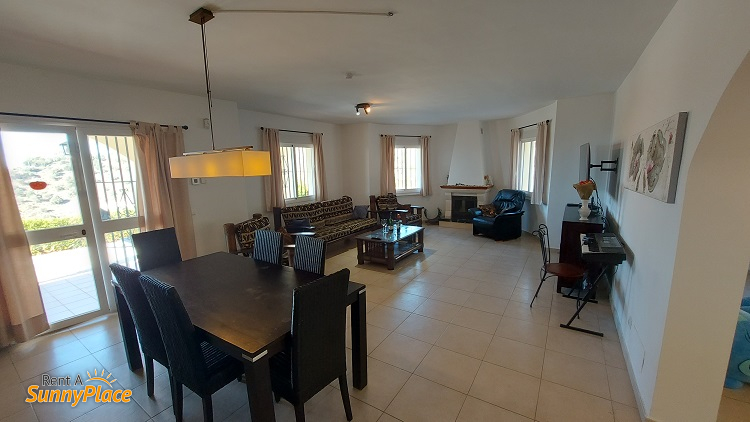 La amplia sala de estar está equipada con un sofá de tres plazas, tres cómodos sillones, una chimenea y un televisor inteligente grande, así como un reproductor de Blu-ray DVD. La cocina semiabierta contigua está completamente equipada con electrodomésticos modernos, que incluyen una placa de cerámica de 4 quemadores, un refrigerador con congelador, un lavavajillas, una cafetera, todos los utensilios de cocina necesarios y un amplio espacio de almacenamiento en los armarios. En una sala de servicio separada se encuentran la lavadora y la secadora. Un arco conecta la cocina con el comedor, creando una transición fluida entre los espacios.
