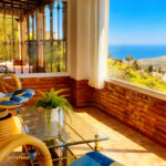 En este piso hay otra terraza/balcón abierto con tumbonas. Varias terrazas con muchos sillones y tumbonas para los huéspedes. Vistas tanto al mar como a la montaña.