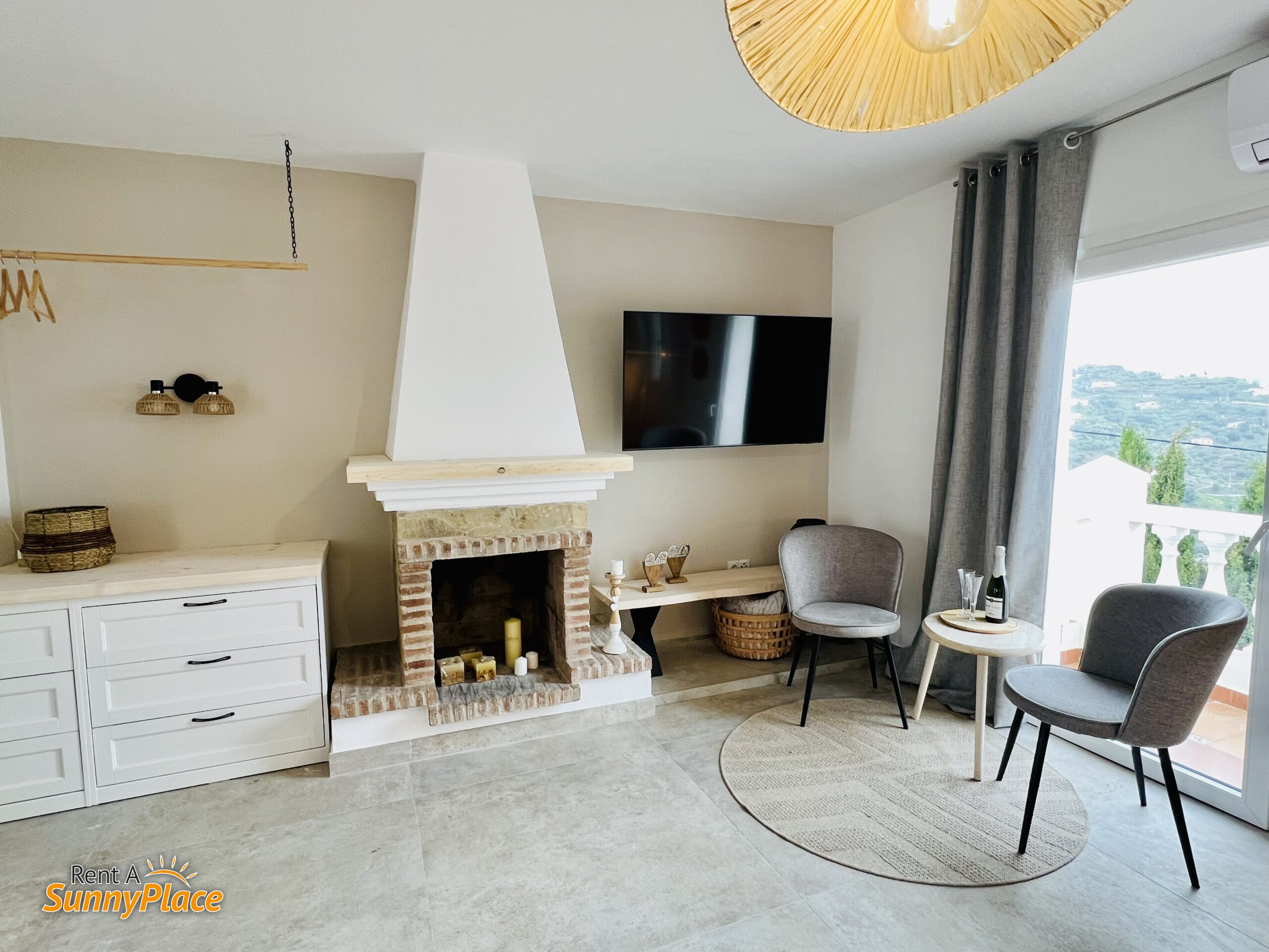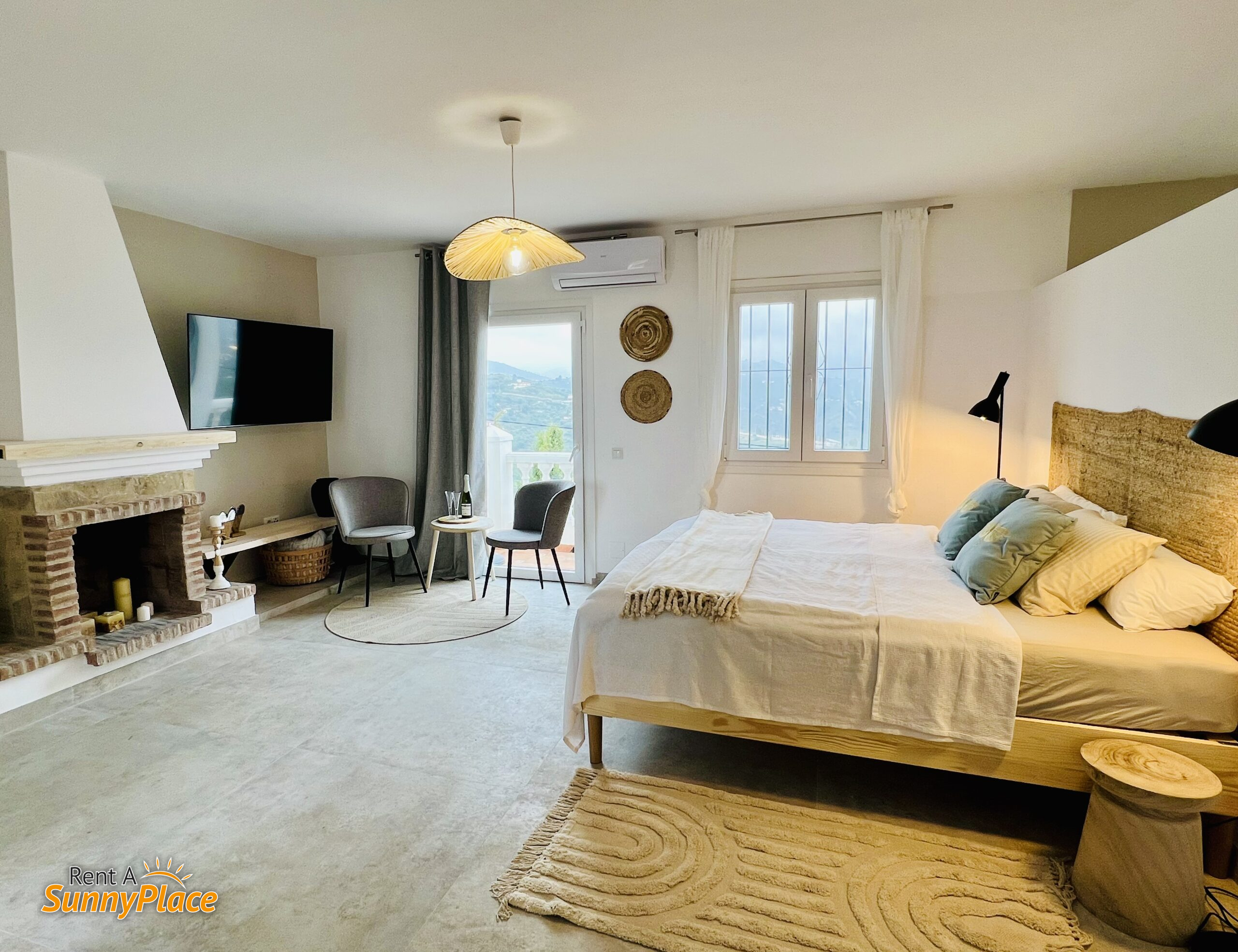 • Espacio abierto tipo salón/dormitorio (n.º 3) con cama doble, chimenea (actualmente fuera de uso), Smart TV, aire acondicionado y dos zonas de estar con vistas al mar y a las montañas. Incluye set de café.